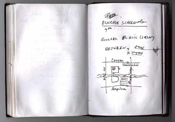 Lee drew this map to show us how to get to the Boulder Public Library where there was a screening of Stan Brackage's "Dog Star Man" that night. For some reason that I can't recall now, she drew a second map. (click on area for detail) |