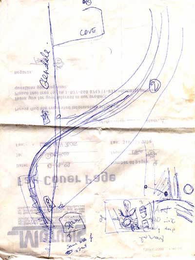 Jim drew us this map to show us places we could go to get a view of the freeway for Dorothea's Inner Rage segment for the Violent show.
