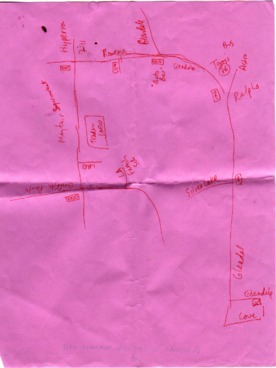 Meryl drew this map to show us where the supermarkets were near Silverlake. We went to Ralphs and Trader Joe's. The 76 gas station was where we had our bus worked on by Meryl's mechanic Tony for 2 weeks. This map is similar to another for the airport, drawn by Lou. (click on area for detail) |