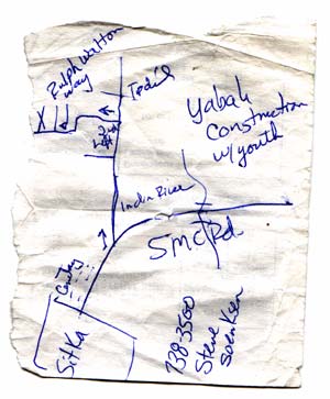 At the YABAH construction site, teenagers were working to build new housing. Steve drew us this map, but it turned out we didn't have time to go.