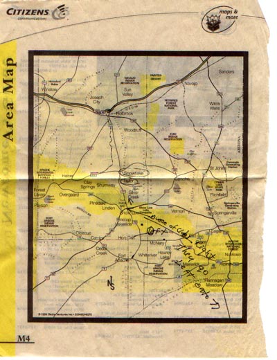 Tom marked this map, a page from their telephone book, to show us how to get to Holbrook, where there might be an automobile shop open on a Sunday so we could get our tire replaced.